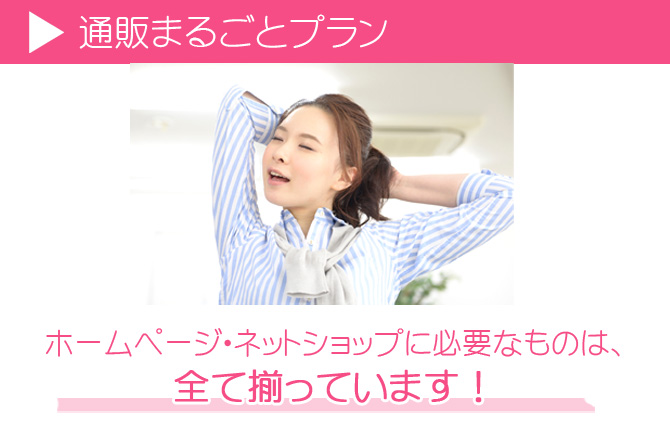 スマートフォン対応のホームページの制作、ドメインやサーバーの設定から、制作後の更新管理、ネット販売の販促、ショッピングモール出品など全てが揃ったプランです。