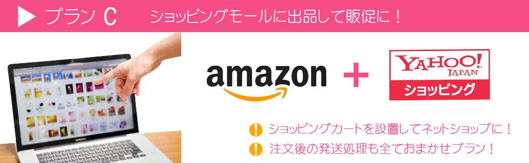| その他 | サンプル百貨店等の販促サイトに出品を行い、新商品の販促及び過剰在庫販売の代行をします。 ※既に自社でアマゾンに出品されている方は、このプランですと同じ様な費用でアマゾンの他にYahoo や北市ドットコムにも出品されるのでお得になります。出品作業は、もちろん当社が行います。 |